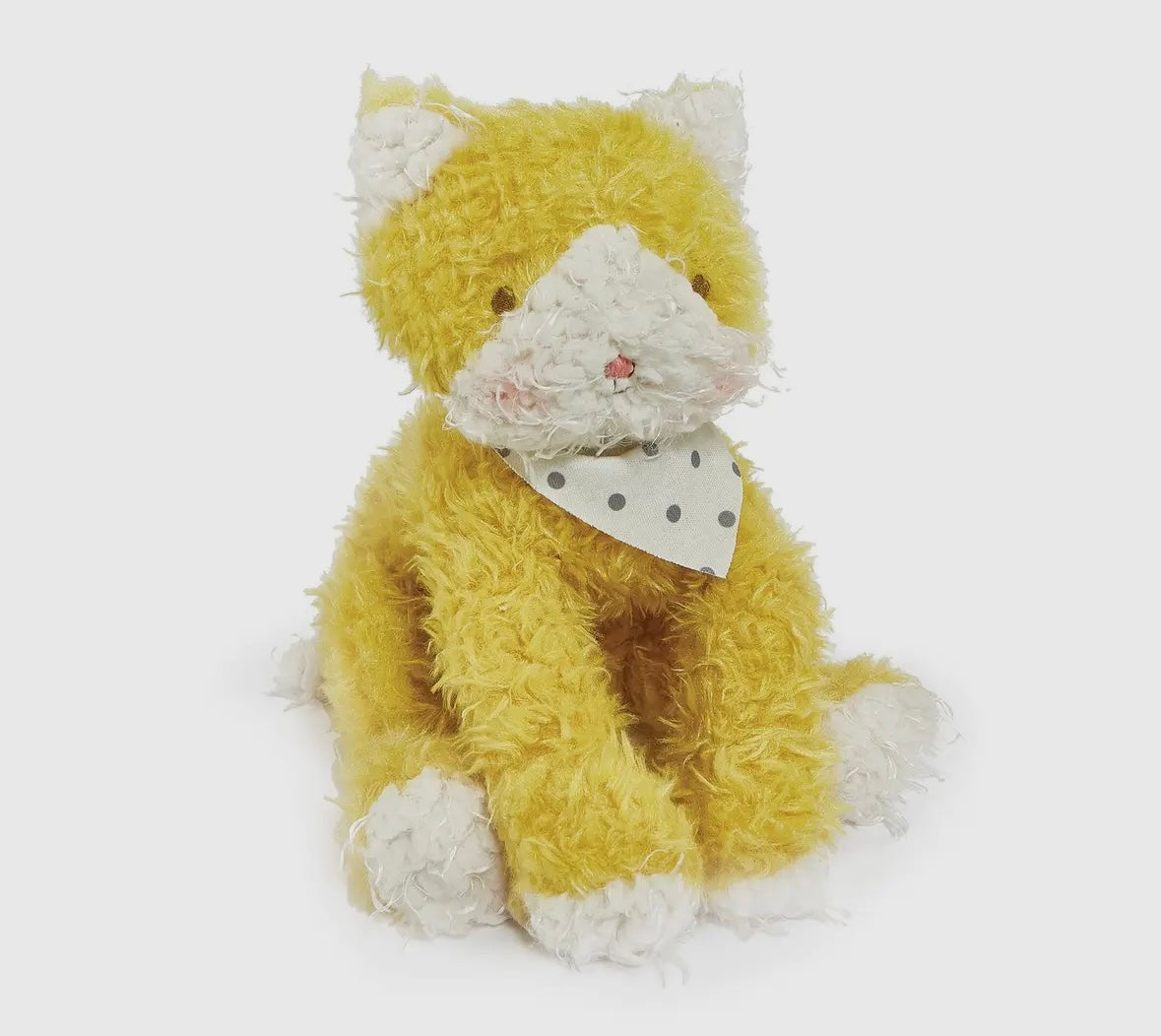 By popular demand, Alley is back on the farm. This adorable kitty cat has mustard yellow scruffy fur with a scraggly cream muzzle we all love. Embroidered face and stylish cream scarf with gray polka dots tied about her neck, make Alley Cat, the cutest little kitten around