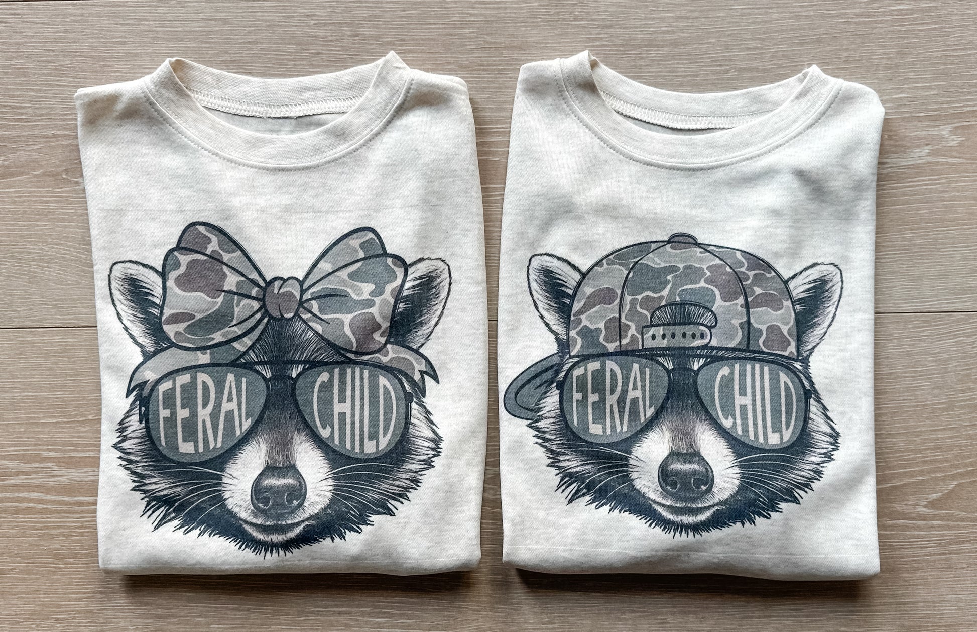 🦝 Because every kid has a little chaos in them! This camo “Feral” raccoon long sleeve pullover says it all — cute, wild, and just a little unhinged. Super soft fabric and a playful design make it a must-have for your tiny troublemaker. 🫶🏻